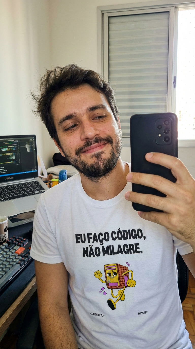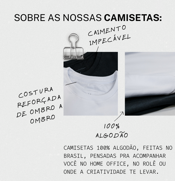 Nossas camisetas usam algodão brasileiro de alta qualidade, confortável e leve para todos os climas.